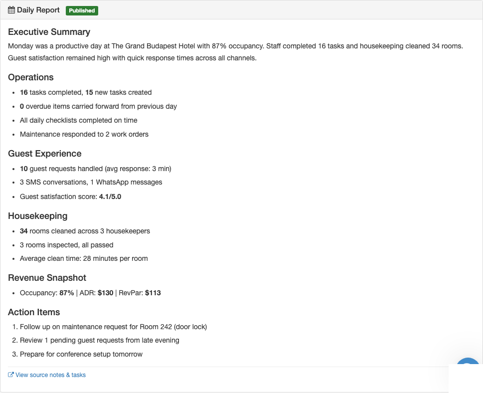 Automated daily & weekly reports: Get comprehensive operational summaries delivered every morning, covering guest experience, housekeeping, revenue, and more β generated automatically around 6 AM in your property's timezone.